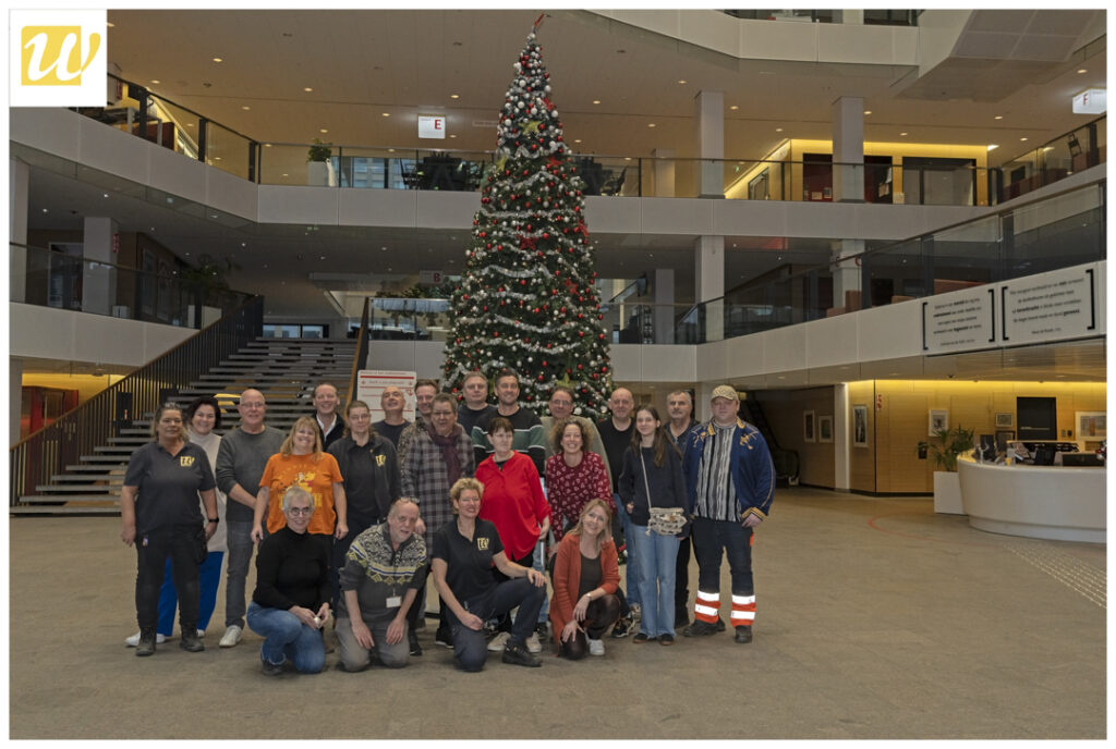 Op locatie weet iedereen dat de feestdagen beginnen zodra de enorme dozen met kerstspullen weer worden binnengebracht. Met een groep collega’s, medewerkers en staf van het UW, bouwen en tuigen we de boom samen op. En nee, dat is niet in een-twee-drie gebeurd, maar juist daardoor een extra leuk en gezellig moment. Maar als hij dan eindelijk staat, hoog, mooi en vol lichtjes en gekleurde kerstballen, dan kan de feestmaand echt beginnen.