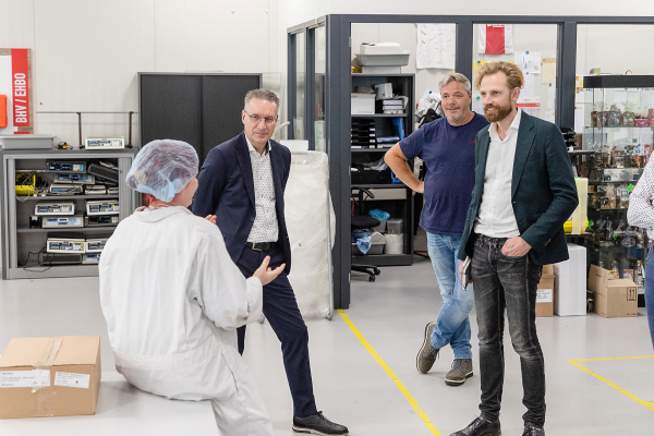 Dennis Wiersma, werkleider Peter de Visser en UW-directeur Gertjan Stoker praten met Sharona over haar werk bij de afdeling Verpakken.