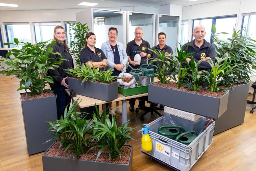 Zoals vaak bij het uitvoeren van werkzaamheden is een goede voorbereiding het halve werk. Margret: “Bij elke klant gaan we eerst op de locatie kijken. Dat doen we om de klant goed te kunnen adviseren over planten die geschikt zijn voor die locatie. We adviseren ook over het soort bakken en de kleur van de bakken. Voor de kleur kijken we naar de kleuren die er al gebruikt worden. Bij een witte ruimte geeft een witte bak minder sfeer en warmte dan een gekleurde bak. Daarbij moeten bakken ook matchen met de kleuren van de vloerbedekking en de meubelen.” Na akkoord van de klant op het voorstel bestelt UW Flora de planten met de bakken bij de leverancier.